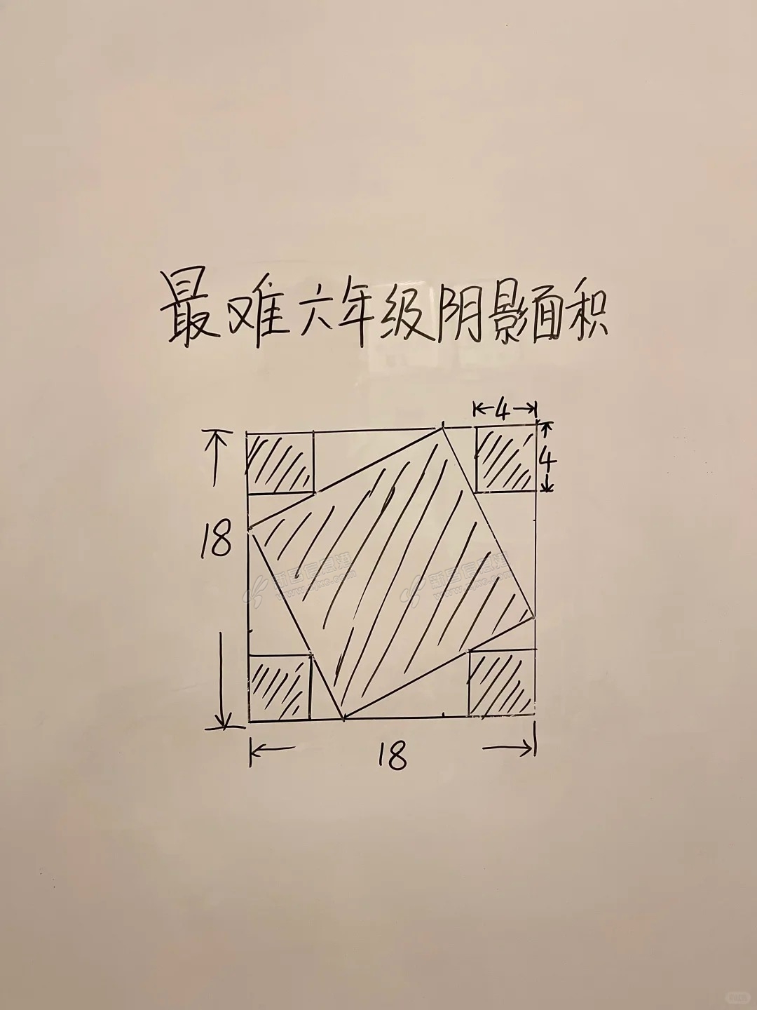这不是很简单吗? 阴影的面积=整个正方形面积-空白的面积 18×18-4×(18-4-4)÷2×4=244 |