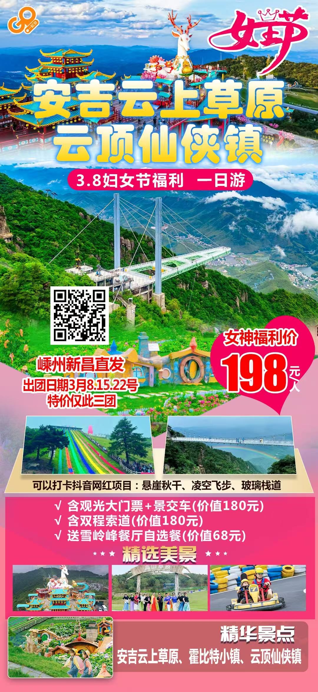 [太阳]安吉云上草原、仙侠小镇特惠一日游(含中餐) 女士价:198元/人 男士价:278元/人 [礼物]含观光大门票+景交车(价值180元) [福]含双程索道(价值180元) [吃瓜]含雪岭峰餐厅自选餐(价值68元) [加油]出发日期:3 ...