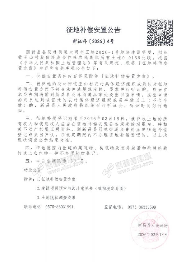 征地补偿安置公告(新昌县羽林街道大明市区块2026-1号地块) 来源:新昌县自然资源和规划局原标题:征地补偿安置公告